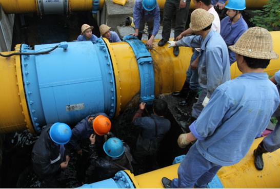 當(dāng)時,工作人員正在現(xiàn)場巡視,實(shí)然發(fā)現(xiàn)市排DN800管道流量計(jì)后硬性伸縮節(jié)滲漏噴水,于是立即按照報(bào)告制度進(jìn)行匯報(bào),該公司立即啟動應(yīng)急預(yù)案。搶修分兩路展開,一隊(duì)人員用應(yīng)急水泵,將滲漏的污水打入生產(chǎn)系統(tǒng)中;另一隊(duì)人員對滲漏點(diǎn)進(jìn)行檢查,確定是因硬性伸縮節(jié)的兩顆螺絲膨脹后崩斷造成爆管。在通知排水公司對進(jìn)廠流量進(jìn)行控制的同時,現(xiàn)場搶修指揮人員立即組織維修人員對硬性伸縮節(jié)進(jìn)行更換。維修人員在采取相關(guān)安全措施后,冒著不斷噴出的污水,立刻進(jìn)行拆裝螺栓作業(yè)。隨著水流一點(diǎn)點(diǎn)變小,漏點(diǎn)最終被徹底控制。